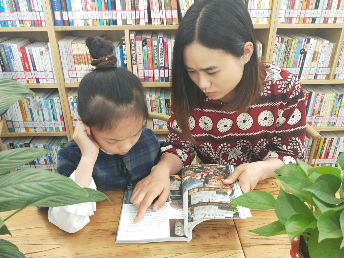 社区居民和女儿在翻阅书籍,讲解台湾民俗风情。
