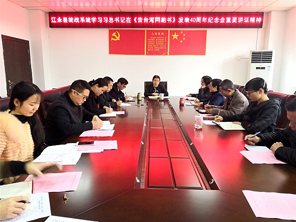 1月23日,在江永县委统战部理论中心组(扩大)2019年第一次集中学习会上,全体干部职工专题学习了习近平总书记在《告台湾同胞书》发表40周年纪念会上的重要讲话精神,县委常委、统战部长谭美池出席会议并做重要指示。会上,统战部副部长、台办主任何丽组织大家学习了习总书记讲话原文,并对讲话精髓进行了解读。谭美池要求,要进一步把广大干部群众的思想和行动统一到总书记重要讲话精神上来,扎实做好对台工作,宣传好中央惠台31条和我省惠台59条措施,加强江台两地交流交往,厚植友谊,为祖国统一奉献力量。