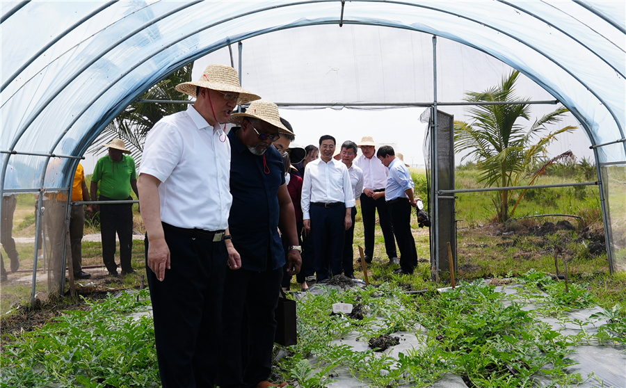 巴巴多斯盛产甘蔗,粮食和蔬菜则大量依赖进口。2021年,湖南与巴巴多斯签订农业合作备忘录,围绕蔬菜种植、旱稻种植等展开一系列务实合作。21日,代表团一行实地考察湖南援巴农业蔬菜大棚及旱稻种植项目。眼下刚进入雨季,大棚内、田埂上,从中国“漂洋过海”而来的西瓜、豆角等蔬果青翠欲滴、长势喜人。尤其是通过精准滴灌和精细管理,湖南的旱稻在这里喜获丰收,折合产量7.49吨/公顷,不仅实现当地旱稻种植“零”的突破,还赢得巴巴多斯政府的高度赞扬认可,今年试种面积持续扩大。毛伟明高兴地说,巴巴多斯的农业自然条件好,湖南的农业资源技术实力强,双方的务实合作让人看到了设施农业、现代农业的光明前景。要选育优良品种、推广先进技术、培训本土人才,为巴巴多斯实现粮食自给自足贡献湖南智慧和力量。